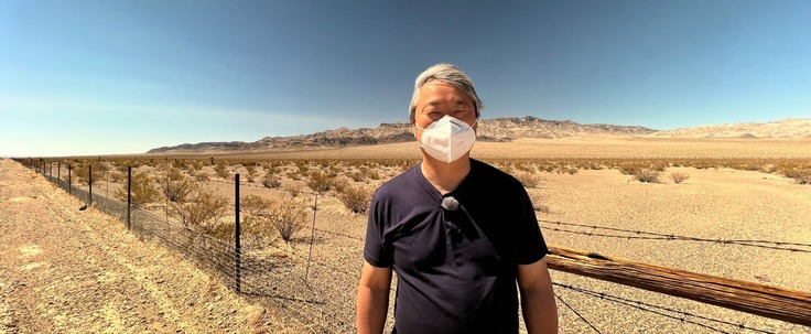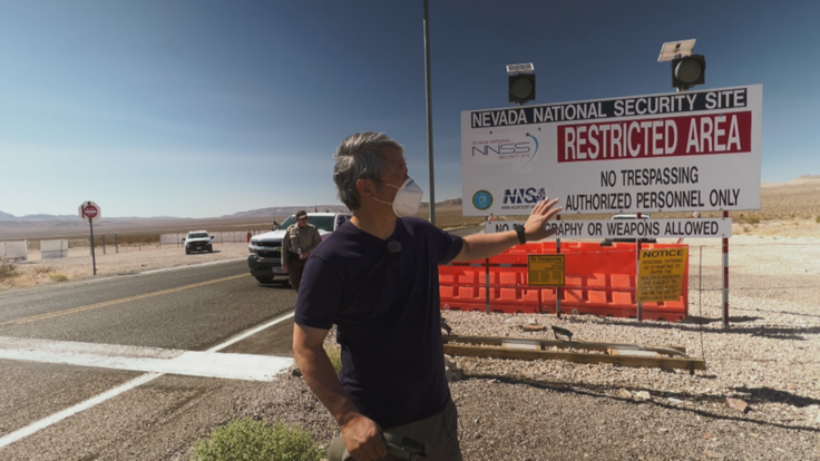 ネバダ核実験場の前で