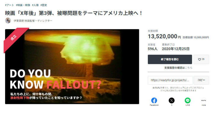 ※プロジェクト成立後、天災等やむを得ない事情(緊急事態宣言などコロナウイルスによる影響を含む)により、実施予定期間中にアメリカでの上映会などができなくなった場合、翌年などに延期をして実施します。延期となる場合、皆さまにはその旨をお知らせいたします。
