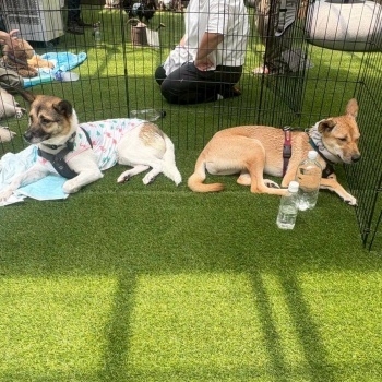 屋根付きドッグランでスポットクーラーが常設とはいえ、蒸し暑いだろうと冷凍ペットボトルや保冷剤、扇風機を数台の持ち込みでなんとかのりきりました。