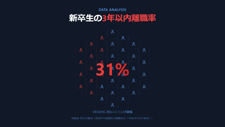 また、「離職率の増加」が問題になっています。現在、日本の新卒採用された人が3年以内に離職する割合は3割を超えています。