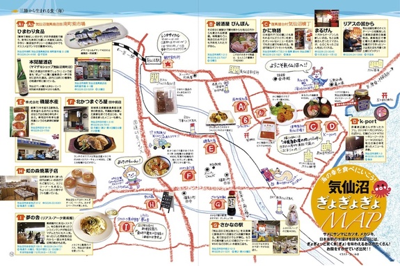 そんなみきさん、ふと何かを説明する時に描いた落書き。これがとってもイカした絵だったんです。これはイケると思い、イラストを頼んでみると、すぐにOK。以来、旅に関するページはみきさんに。6号ではBRT(電車の代わりにJR気仙沼線、大船渡線を走る高速バス)。7号では気仙沼の「ぎょぎょぎょMAP」を担当してもらってます。