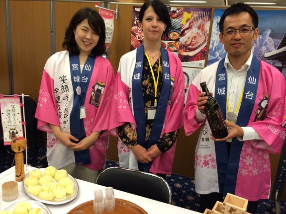 (宮城県職員の皆様による県産品の紹介。ピンクの法被には「笑顔咲くたび伊達な旅」のキャッチコピーが!)