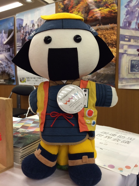 宮城県のブースには、伊達政宗公の兜で身を固めた勇ましい「むすび丸」の姿がありました。むすび丸は豊かな食と文化に恵まれた宮城県を象徴する観光PRキャラクターです。今回は、むすび丸に仙台市さんからいただいた第3回国連防災世界会議バッジ(写真は特大版)を身に着けてもらって撮影しました。