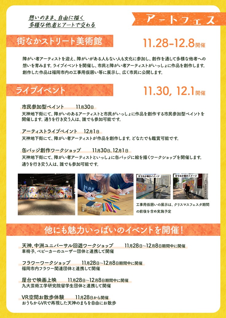 こどもたちがまちなかでアートに触れたり参加できるイベントです。障がいのある天才アーティストと市民や子どもたちのアートがまちにあふれます。