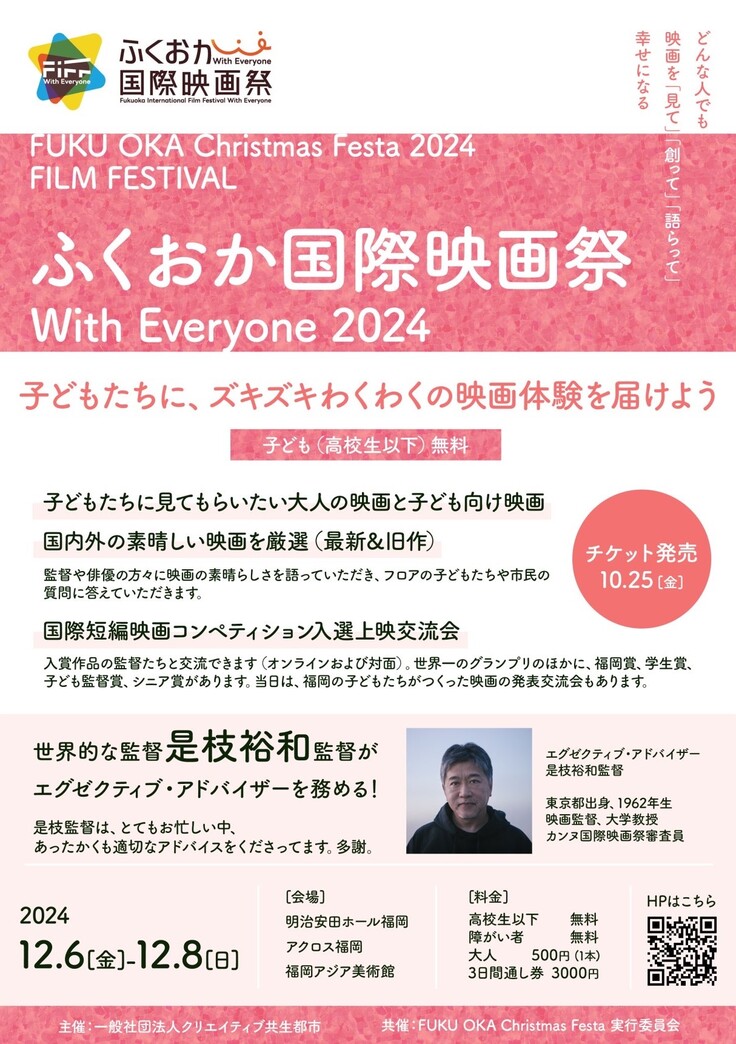 シネマフェスのふくおか国際映画祭のエグゼクティブ・アドバザーは、世界的な映画監督、是枝裕和監督です。是枝監督は、「誰も知らない」「万引き家族」など貧困のこどもたちを扱ったヒューマンな映画をたくさん作ってこられました。