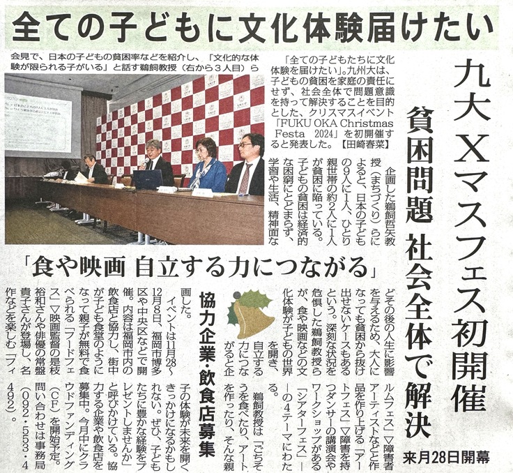 この課題に対してなにかできることはないかと、今回、九州大学教員を中心とした産学官+市民の取り組みとしてFUKU OKA ChristmasFesta2024 実行委員会を立ち上げました。2024年11月28日~12月8日まで期間、4つのフェスを開催し、「子どもたちに忘れられないクリスマスプレゼントを」というテーマで企画しました。