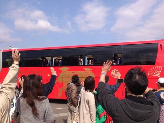 東京では桜が満開となった昨日、中学生12名は南相馬市から成田空港へと無事に移動することができました。大きなスーツケースばかりなので、旅行会社の方と相談して大型バスを利用しましたが、13名しか乗っていないので車内はとっても快適だったようです。