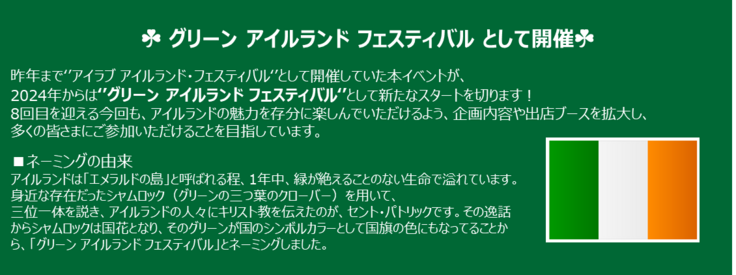 皆様に親しみいただいてきたアジア最大のアイルランドの祭典“アイラブアイルランドフェスティバル”は、今年イベント会場が代々木公園の緑(グリーン)に囲まれた“パノラマ広場”への変更に伴い「グリーン アイルランド フェスティバル」とブランドを変えて実施させていただくこととなりました。