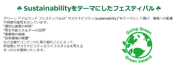 アイルランド及びアイルランド最大の祭典である“セントパトリックスデー”のシンボルカラーであるグリーンを冠名にし、GOING GREEN,GREEN IRELANDをキャッチフレーズに“サステナビリティ―”をテーマにしつつ、アイルランドの多様な食や文化、魅力をご紹介するユニークで楽しいイベントにしたいと考えております。 併せて、近接する表参道では、日本最大のセントパトリックスデーを祝う東京パレードをお楽しみいただけます。また、本年元日に起きました能登半島地震の被災者の方々への支援、応援も、このイベントを通じて微力ながらできればと願っております。