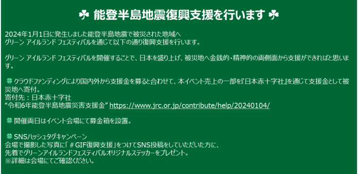 Through the Green Ireland Festival, we would like to offer our support to the areas affected by the Noto Peninsula Earthquake that occurred on January 1, 2024. By organizing the Green Ireland Festival, we hope to help Japan and provide both financial and emotional support to the areas affected by the earthquake.