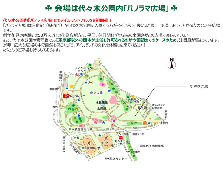 The "I LOVE IRELAND FESTIVAL", the largest Irish festival in Asia, will be rebranded as the "Green Ireland Festival" this year, following a change of venue to the "Panorama Plaza" surrounded by the greenery of Yoyogi Park.The new venue is more accessible from Harajuku Station and is located in the main area of Yoyogi Park, so more than 200,000 people are expected to visit the festival. This will also be the first event to be held here by an organization outside of Tokyo.