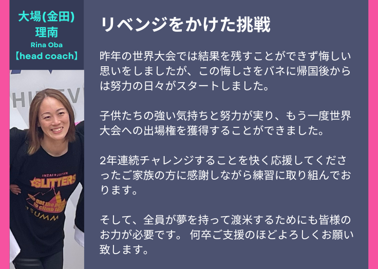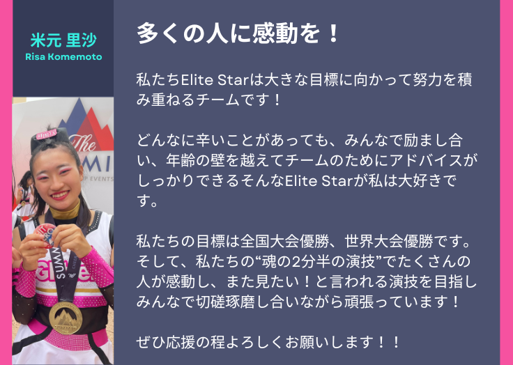 世界大会での演技や結果で、多くの人にチアリーディングを知ってもらえる機会を作るためにも、応援よろしくお願いします!