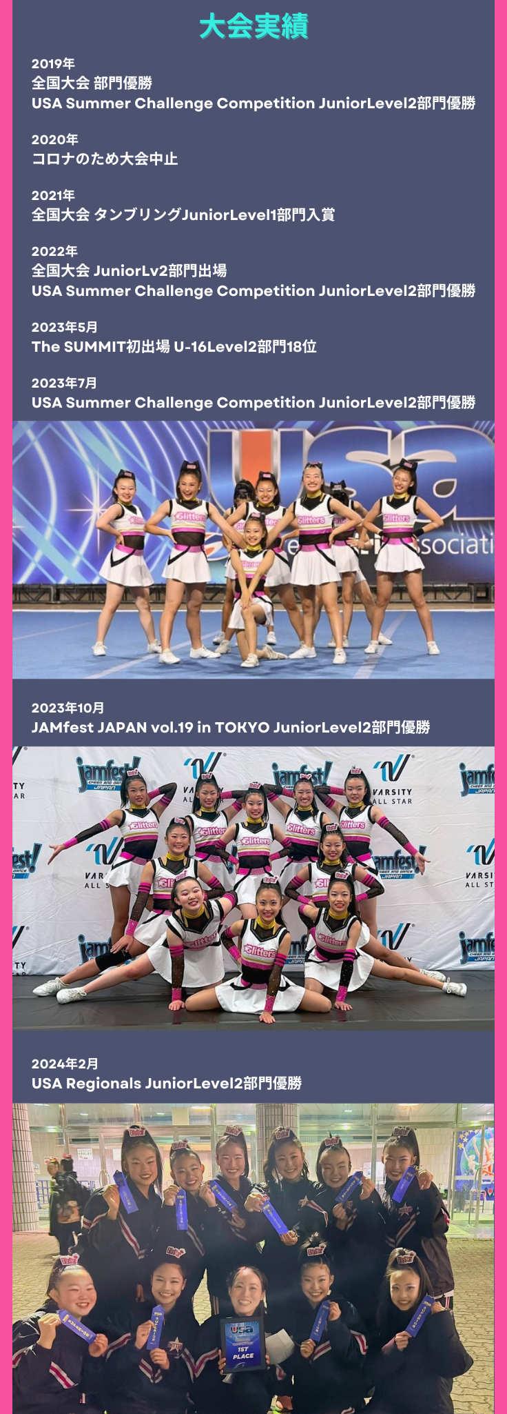 Inzai Cheer Glittersは、2013年の設立後、地域のイベントや大会に出場し、現在では、 KIDSクラス、パラチアクラス、選抜チームと、4歳から15歳まで総勢63人が所属しています。
