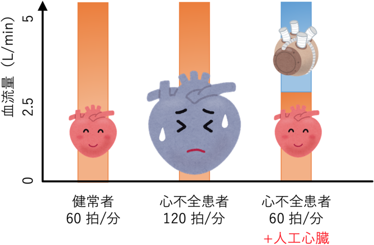 この状態が続けば心臓にとても負担がかかります。そこで、人工心臓によって血流量をポンプで半分を補うことで、心臓を休ませ、4年間におよぶ長い待機時間を乗り切れるようにします。心臓を休ませることによって、心臓の機能が回復することもあります。