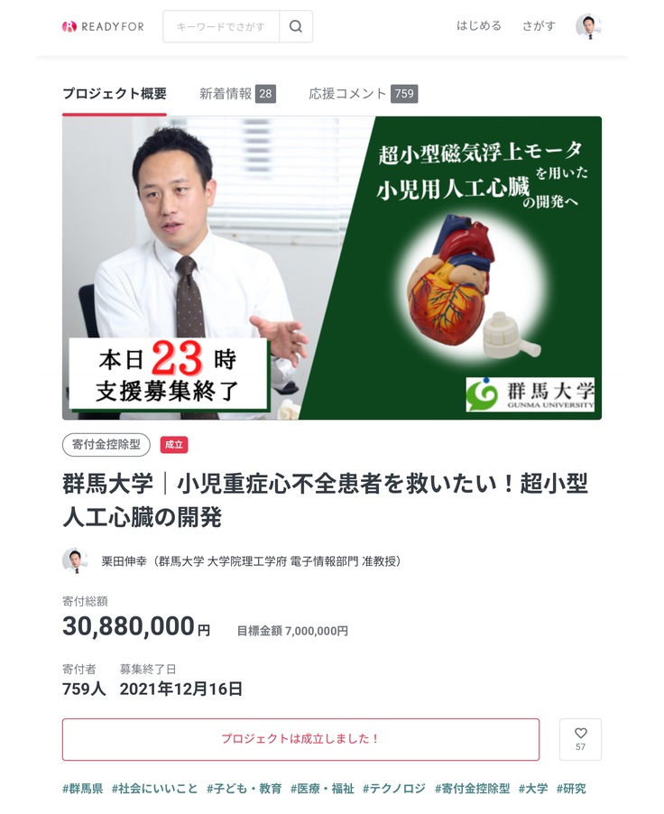 12月16日23時をまわり,プロジェクトが終了しました。実際の人数は今後もう少し増える可能性がありますが,当初の目標金額 7,000,000円に対して,759名以上のみなさまから,30,880,000円以上ものご支援をいただくことができました。本当にありがとうございます。