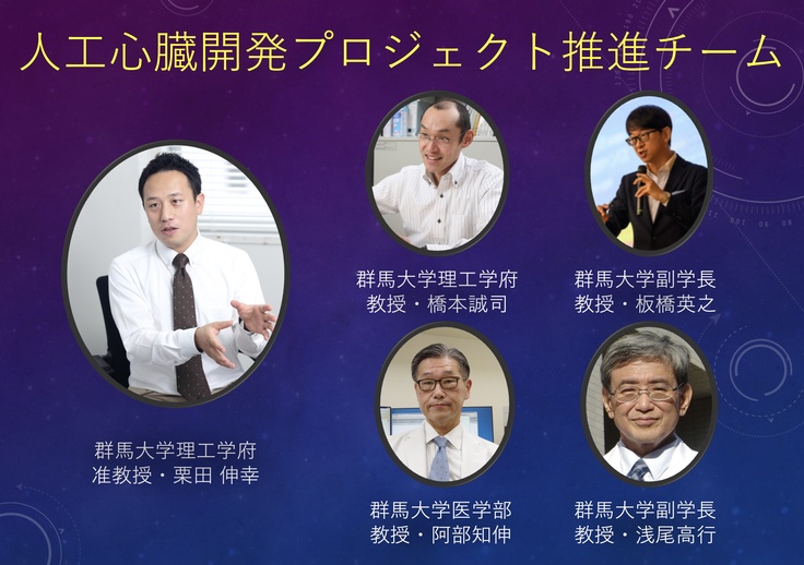 プロジェクト終了(2021年12月16日)の1週間後(2021年12月24日)に,群馬大学において人工心臓開発プロジェクト推進チームを発足しました。研究チームは,理工学府准教授・栗田 伸幸,理工学府教授・橋本誠司,医学部教授・阿部知伸,先端医療開発センター長・浅尾高行,副学長・板橋英之です。