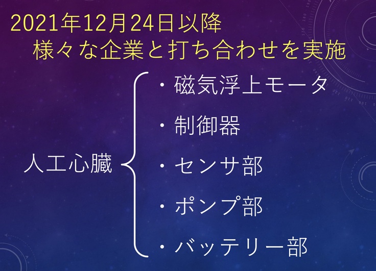 人工心臓の開発のためには,コアとなる磁気浮上モータの他に制御部・センサ部・ポンプ部・バッテリー部など,様々な要素技術が必要となります。そこで,2021年12月24日以降,様々な企業と試作機の製作にむけた打ち合わせを行っています。