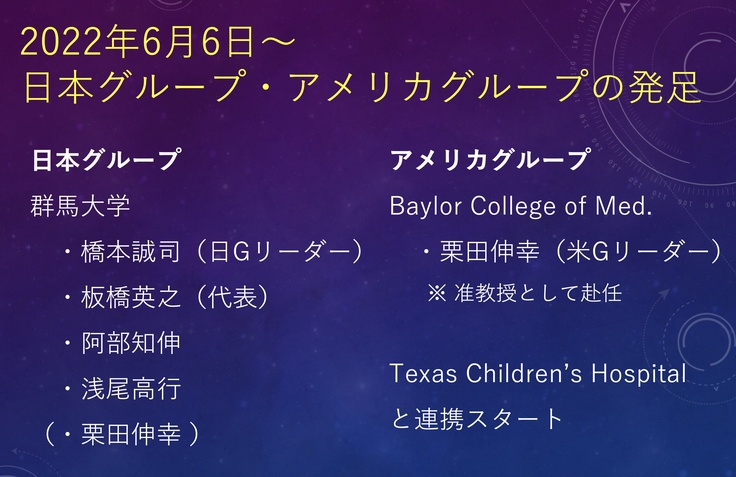 6月6日からは日本グループとアメリカグループを発足しました。理工学府准教授・栗田 伸幸は群馬大学の休職制度を利用して群馬大学に席を残したまま渡米し,テキサス州のベイラー医科大学・テキサス小児病院の准教授として,研究開発に取り組みます。