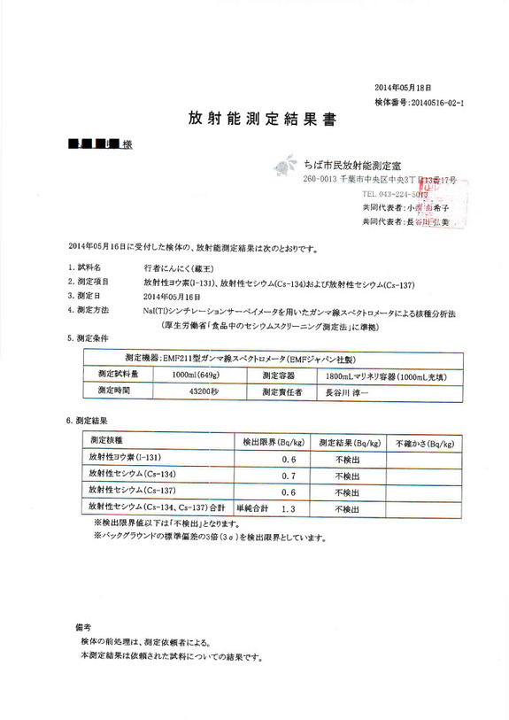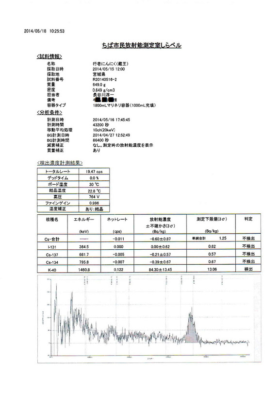風は色んなものを運んできます。口に入れる農産物については、放射性物質の検査状況が気になるかたもいらっしゃるとおもいますので、当園の行者ニンニクを検査した際の結果書を載せておきます。