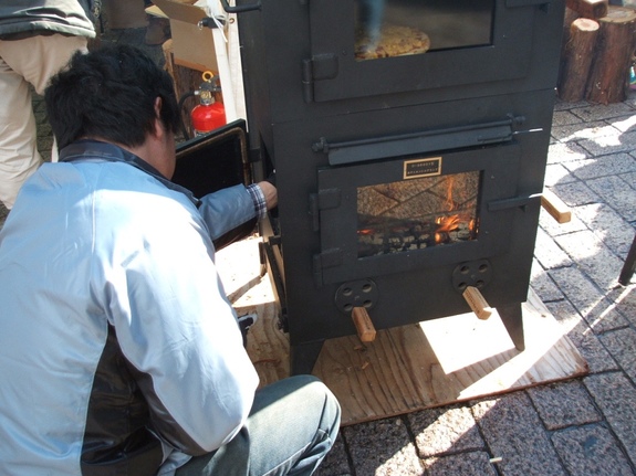 各種木工品の展示&販売の他、薪ストーブと丸太コンロの燃焼実演、薪ストーブで作った窯焼きピザの試食と、丸太コンロを使い豚汁の試食と焼きマシュマロ体験、全て無料で振る舞いました。