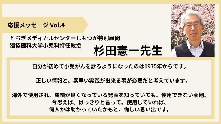 獨協医科大学、とちぎメディカルセンターしもつがの杉田先生より、本プロジェクトへの応援のメッセージをお寄せいただきましたので、ご紹介いたします。
