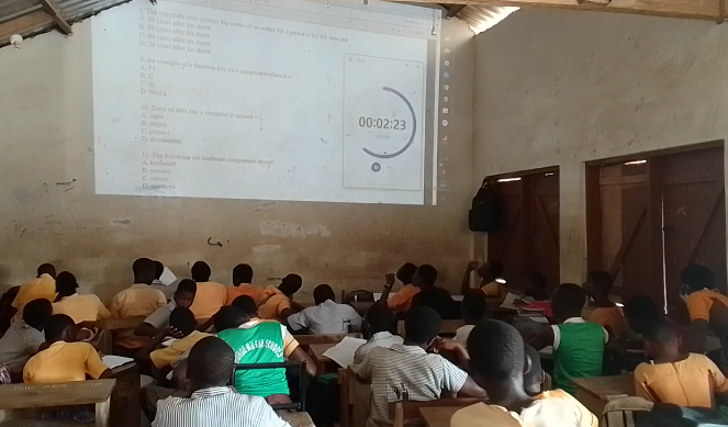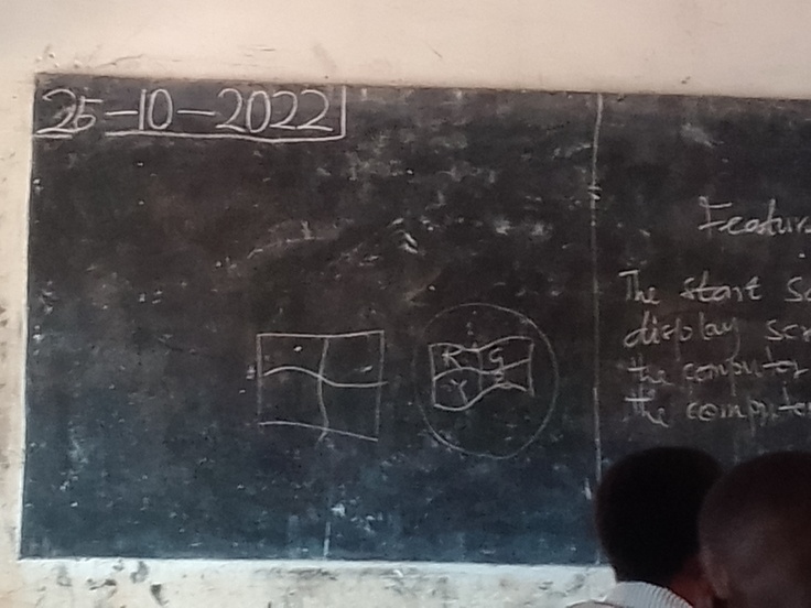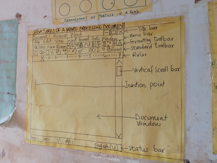一枚目の写真はWordの各部分の名称を模造紙にまとめたもの。二枚目はWindowsスタートボタンを黒板に描いたものです。これがガーナにおけるICT(Computing)授業の現状です。残念ながらほとんどのガーナの学校には生徒達が使えるようなパソコンはなく、ICTスキルを高めるような授業内容ではありません。そのため、生徒たちは「ウィンドウ上部にある水平のバーをタイトルバーと呼ぶ」のようにICTに関わる用語を丸暗記するだけの授業になってしまっています。