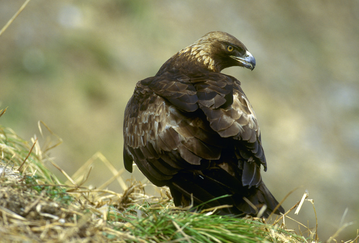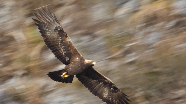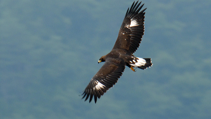 イヌワシは、日本の山岳地帯に生息する最も大きな猛禽類です。体長80〜90cm、翼を広げると2mもある大きな鳥です。悠々と大空を飛翔する姿は「空の王者」と呼ぶにふさわしい貫禄があります。