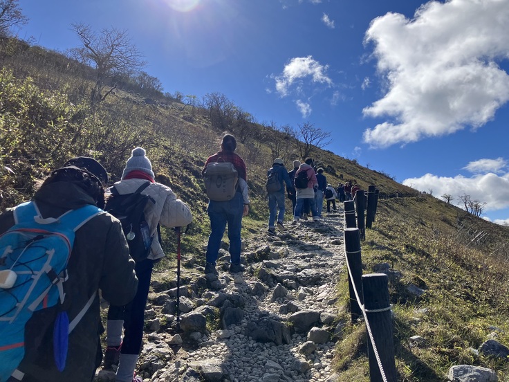 山頂登山組は13時に駐車場を出発して西遊歩道を登っている途中に、眼下を飛行するイヌワシを見ることができました。9合目の展望台では西からの非常に強い風に煽られて、スマートな皆さんは吹き飛ばされそうになっていました。体重のある僕でさえ、まっすぐ歩くつもりが風に流されて斜めに歩いていました。