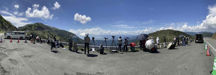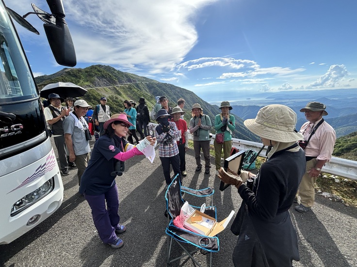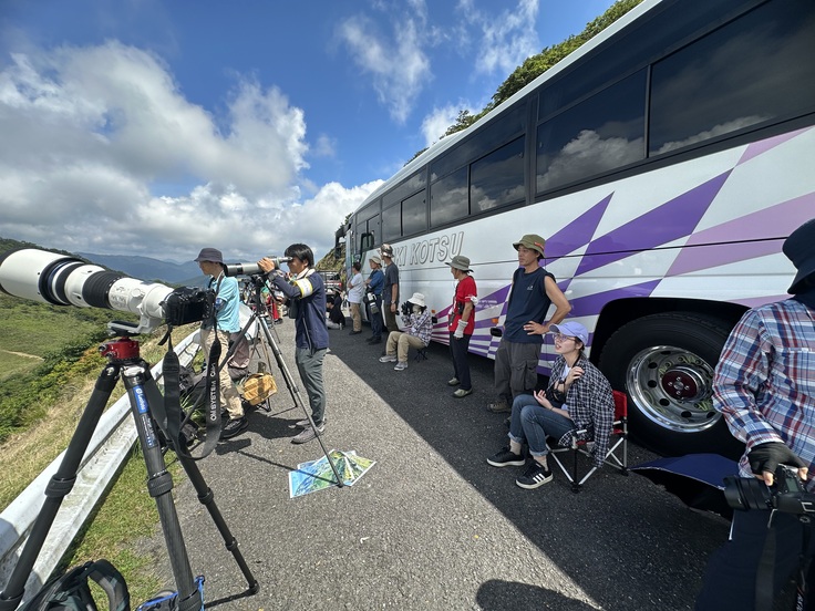 サーナを探して皆で観察を続ける。それにしても今日は暑い。標高1,000mを越える山の上とは思えないほど暑すぎる。バスが作る日陰に入って観察する。