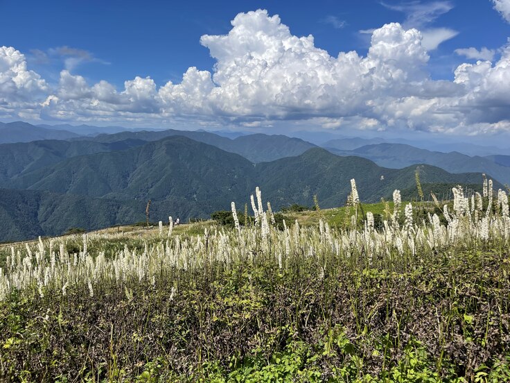 山頂への散策は、サーナが出現していないので観察を続ける人が多く、今回は少人数で出発。歩人倶楽部さんの花の案内を聞きながらゆっくりと登山。山頂部一帯はシカ侵入防止策で囲ってあるので、外側よりも明らかにたくさんの植物が生育している。それでも柵の内側にも少数のシカがいる。シカが食べない植物が残って目立っている。シカが食べないサラシナショウマが白く咲き誇っている。