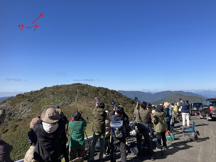 10:43、観察開始から1時間後にサーナが旋回しながら姿を現した。青空をバックにサーナは白斑を輝かせてゆっくりと旋回上昇後、滑翔して尾根裏に消えた。1分足らずだが、皆が観察できるだけの余裕があった。