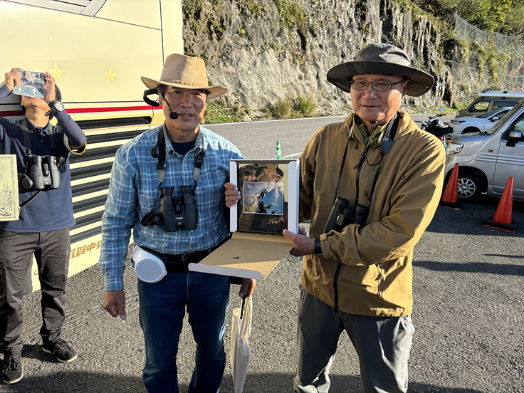サーナの第一発見者に送る「ファーストディスカバリー賞」は、歩人倶楽部さんでした。歩人倶楽部さんはいつも観察会に駆けつけてスタッフとして参加していただいています。賞はスタッフを除くことにしていますが、今回は特別にこれまでの感謝の意を込めて、第一発見者としてイヌワシ額入り写真をお贈りしました。