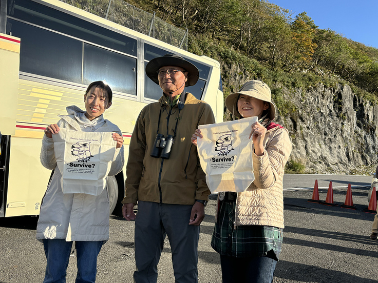 サーナへの獲物受け渡しの手掛かりとなった母ワシ発見者の青柳 咲絵子さんと、サーナのそのうが膨れていることの確認に繋がる飛行を発見された柴田 果菜さんに、歩人倶楽部さんから可愛いイヌワシイラスト入りの手提げが手渡されました。