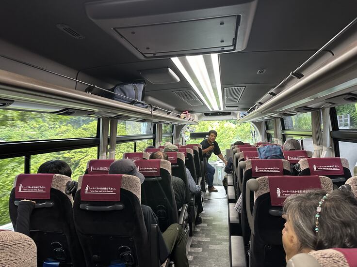 今回のバスは納車されて3日目の新車ホヤホヤ。最前列から後部まで天井に連なるLED照明や綺麗な座席など、気持ちよくバスに揺られて観察地点へ向かった。