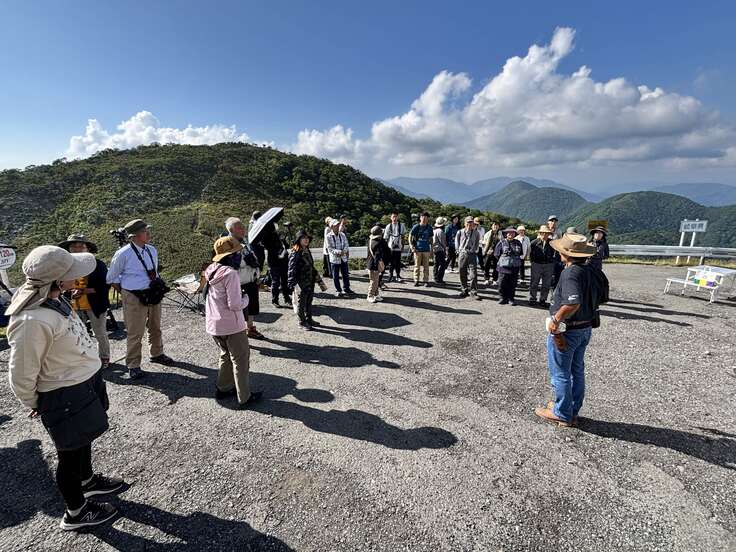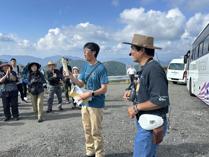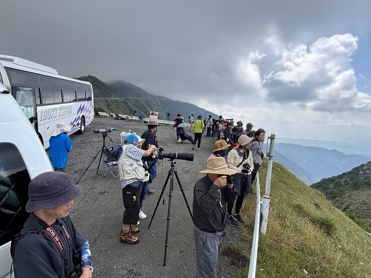 昼食とトイレのためにバスで山頂駐車場へ向かう。午後には霧が晴れると踏んで、昼の休憩を予定より30分早めて午後の観察に備えた。
