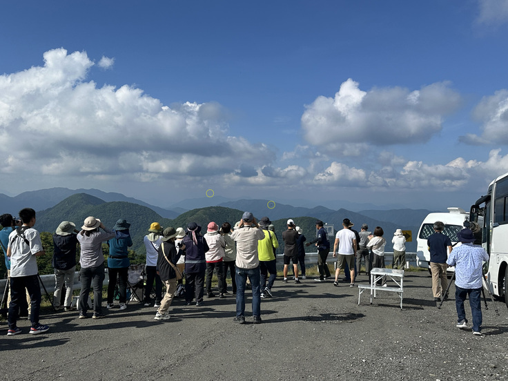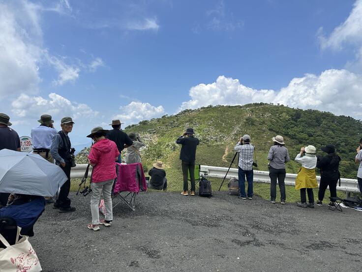 皆が集中してイヌワシを探す。1時間が経過し、イヌワシは現れるのかと不安になり始めたその時、背後の上空にイヌワシが現れた。ペアで北方向へ滑翔する。