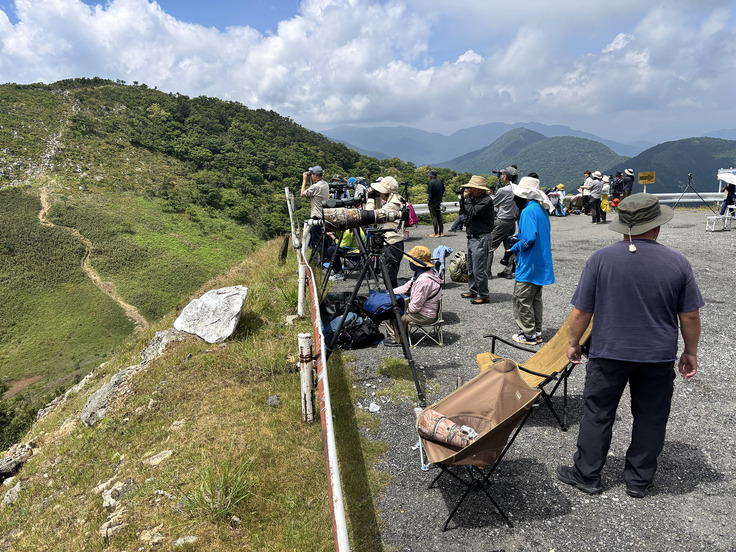 イヌワシが飛行している地点を皆さんに説明しながら追跡する。しかしもう追跡しているのはイーグレットのスタッフだけになっていた。長い追跡のあと、ペアは北へ4km以上飛行して、暗い山の斜面がバックになったところで見えなくなった。