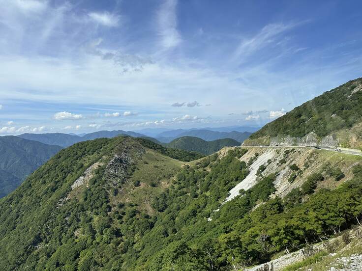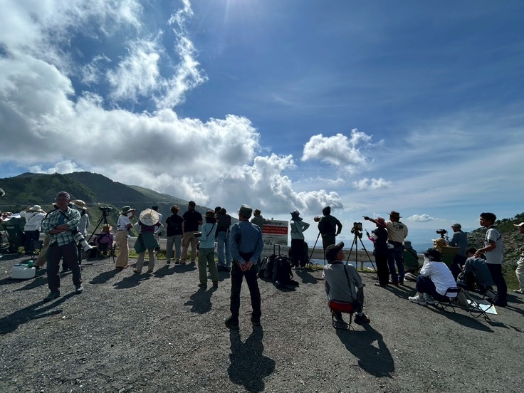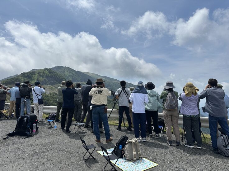 霧はなかなか晴れない。前回同様に昼の休憩を30分早めて山頂駐車場へバスで向かった。霧が晴れてきて、観察地点でイヌワシが出現したと無線連絡が入った。山頂駐車場からも探すが確認はできなかった。