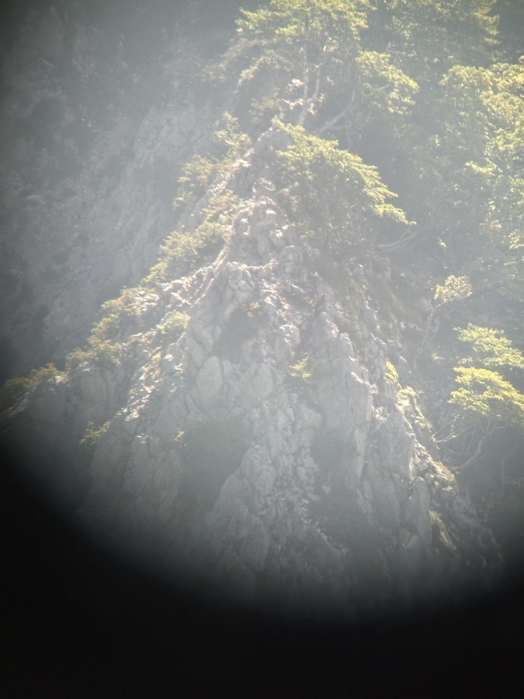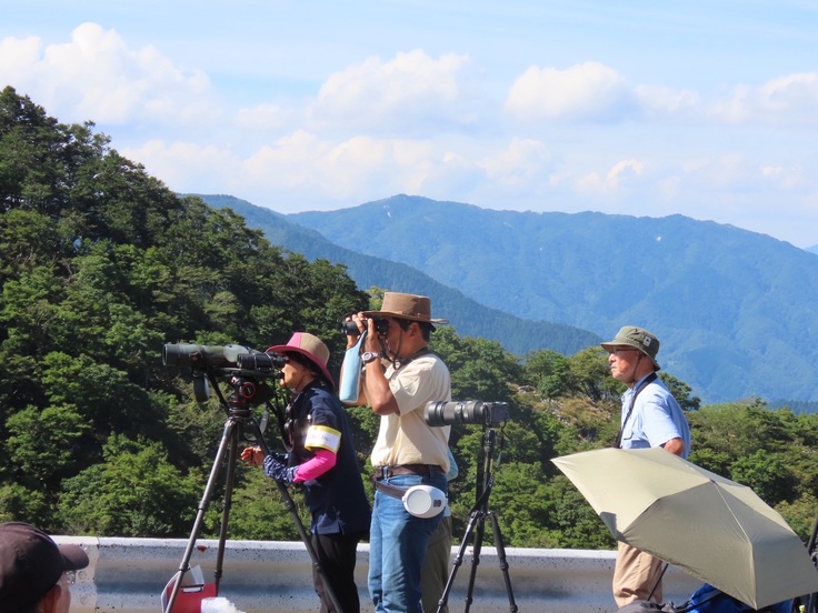 観察地点に戻って皆が真剣にイヌワシを探す。間も無く雄ワシが滑翔して我々が見下ろしている沢に入って消えた。