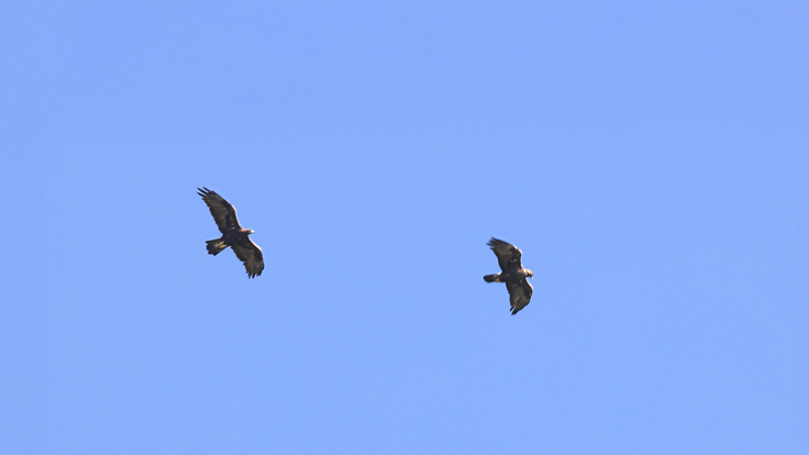 9月の心地よい風に乗って飛行するイヌワシを探し行動を追跡します。ドライブウェイの待避所から定点観察します。