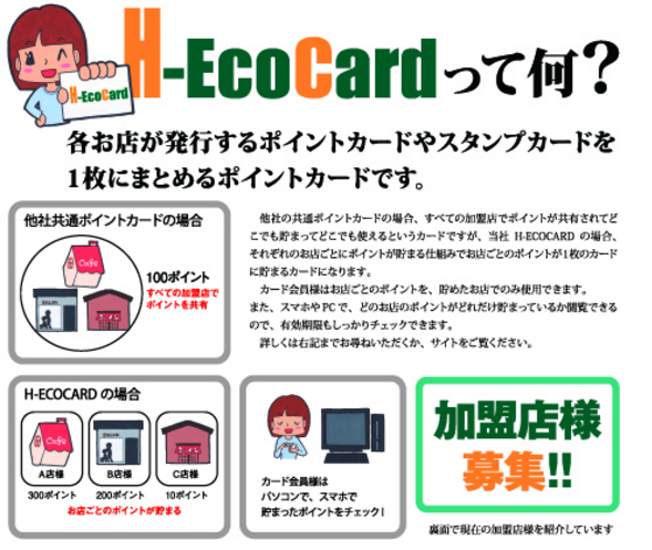 「H-ECOCARD」の特徴を簡単に説明させて頂きますと他社が運営する共通ポイントカードとは異なり、加盟店様同士ならどこでもポイントが貯まり、どこでも使えるというポイントカードではなく、従来のポイントカードやスタンプカードと同様、ポイントを貯めたお店でのみ貯めたポイントを使用できるポイントカードとなります。つまり、加盟店様それぞれのお店ごとにポイントが貯まる仕組みになっています。