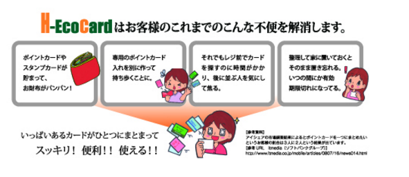 そこで、ポイントカード、スタンプカードを1枚に集約する共通ポイントカードシステム「H-ECOCARD」を考案、開発しました。今までになかった全く新しいタイプの共通ポイントカードサービスでこのサービスは地球環境の保護活動にもなり、地域活性化にもつながり、また、消費者の為にもなる一石三鳥のサービスです。