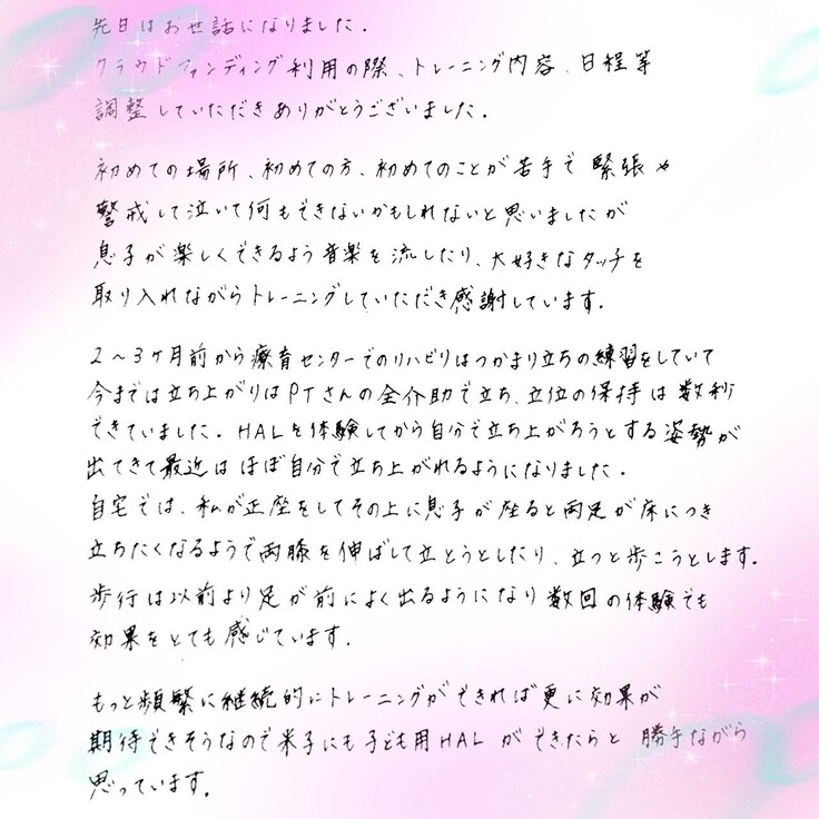 クラウドファンディング#1「HAL®で身体に障がいのあるお子様に光を!」を立ち上げ、身体に障がいのあるお子様20名に初回から5回目までの機能獲得トレーニングを無料で提供、その後継続していただけた方18名に3回に1回無料でトレーニングを提供することができました。