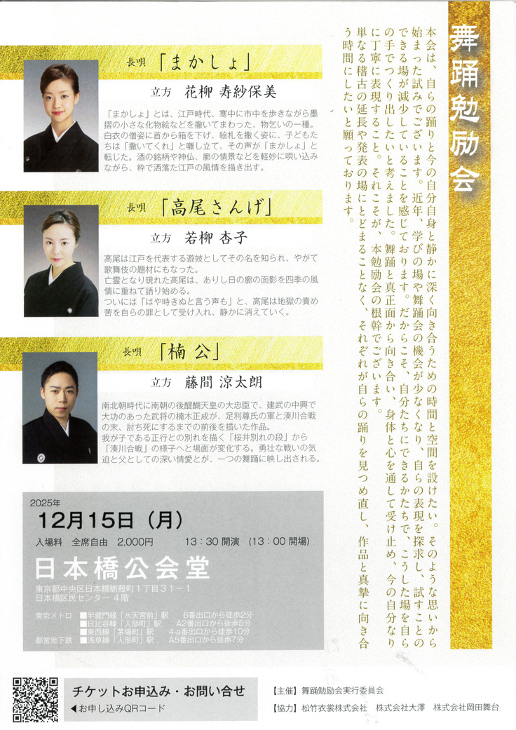 単なる稽古の延長や発表の場にとどまらず、それぞれが踊りを見つめ直し、作品と真摯に向き合う時間にしたいと願っております。勉強会のお申し込みは、以下のフォーム、または各出演者まで直接お問い合わせください。