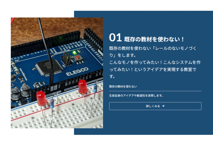 (作品例、スクール内容、料金体系、実施形態、見学申し込み)