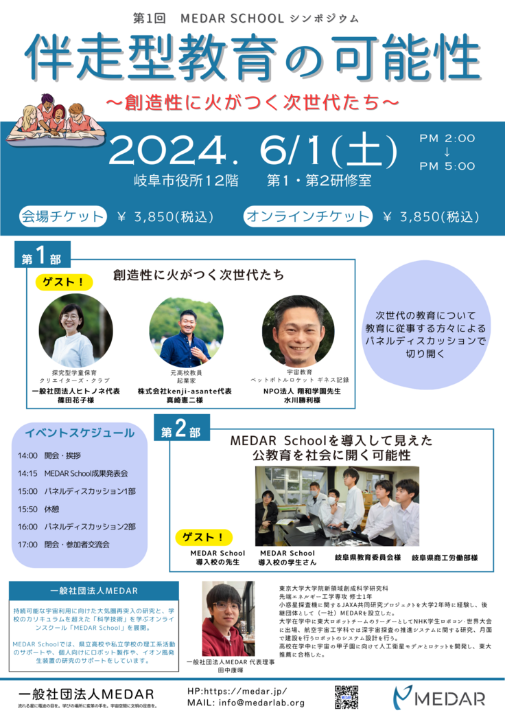 シンポジウムではMEDAR School生徒からの成果発表、2部のパネルディスカッションでは岐阜県教育委員会、岐阜県商工労働部、民間の教育事業者、教員、生徒 に登壇いただき、「創造性に火がつく教育」や「公教育を社会に開く可能性」について議論していきます!