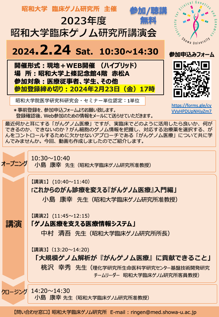 2月24日(土)昭和大学臨床ゲノム研究所主催講演会(現地+WEB開催)のご案内