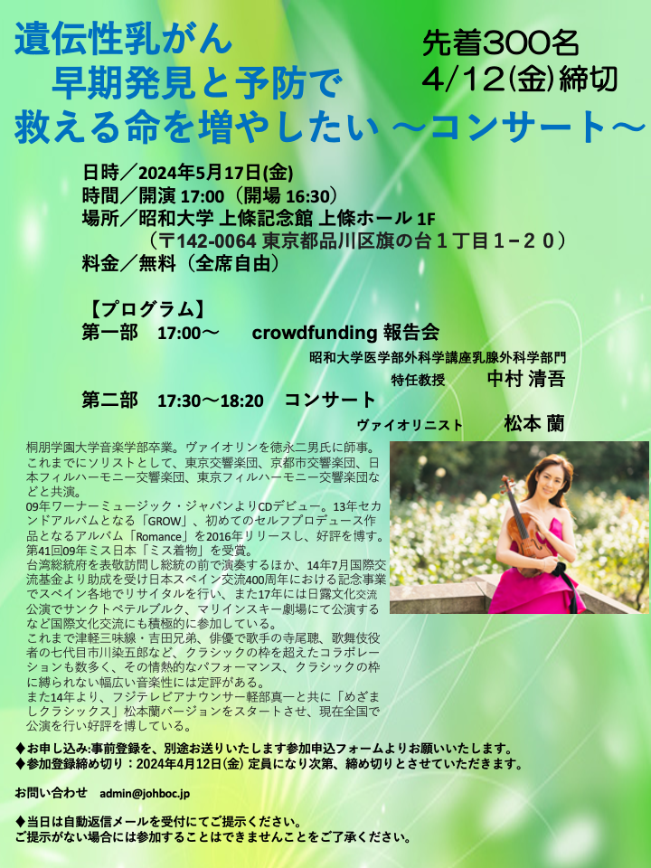 5月17日(金)にcrowdfunding 報告会とヴァイオリニスト松本 蘭さんによるコンサートを開催いたします。本クラウドファンディングへご寄付をいただきました方と同伴者1名様まで、先着300名様をご招待いたします。