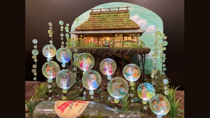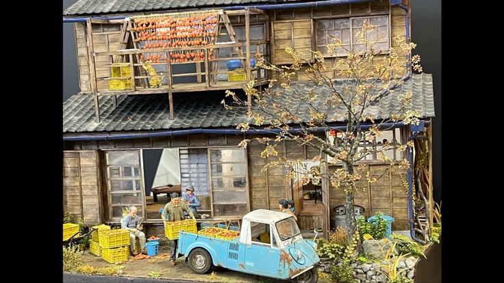 「季節は『秋』。猫の手も借りたいぐらい忙しく家族総出で干し柿作りをする昭和の農家の庭先をジオラマにしてみました。庭の草木、家の居間.台所、車の中など様々な方向から作品をのぞいてみてください。」
