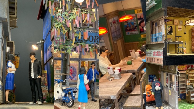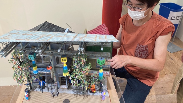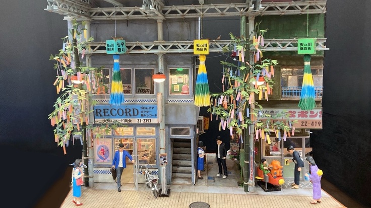 織姫と彦星が出会う七夕祭り、昔は小さな商店街でもよく七夕祭りを見ることができました。出会い、再会、プロポーズ、そして家族へ ふたりの思い出の時間。そんな七夕祭りをジオラマの中に表現してみました。制作においては、アーケードや建物。それぞれの建物の1階2階の内部と作りこむ部分が非常に多い作品になりました。ぜひ、様々な方向から覗いてタイムスリップしてください。